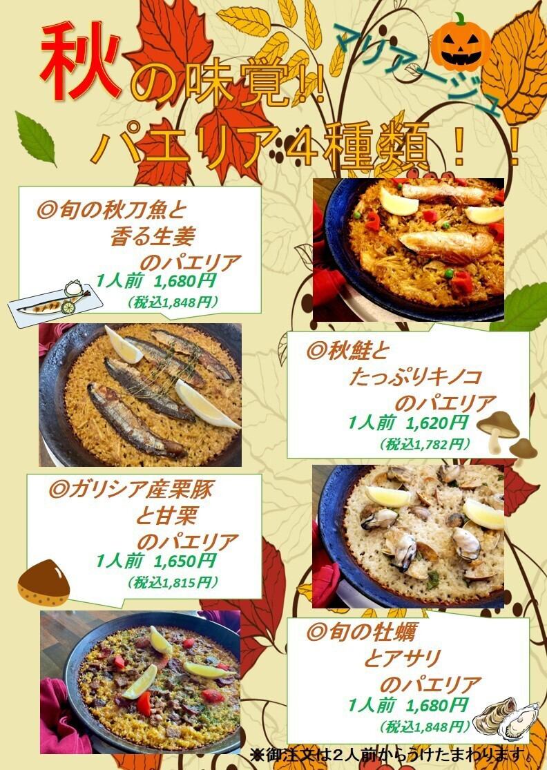 秋の味覚!!サンマ、栗、秋鮭、キノコ、牡蠣などの豊富な秋の食材を使って秋のパエリアを4種類ご用意致しました!その他にも秋の食材を使ったタパスも多数ご用意致しております。食欲の秋を堪能下さい。